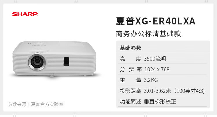 夏普/Sharp XG-ER40LXA 投影儀 商務辦公 教學培訓 家用 酒店會議投影儀 標清3500流明 白天直投 官方標配